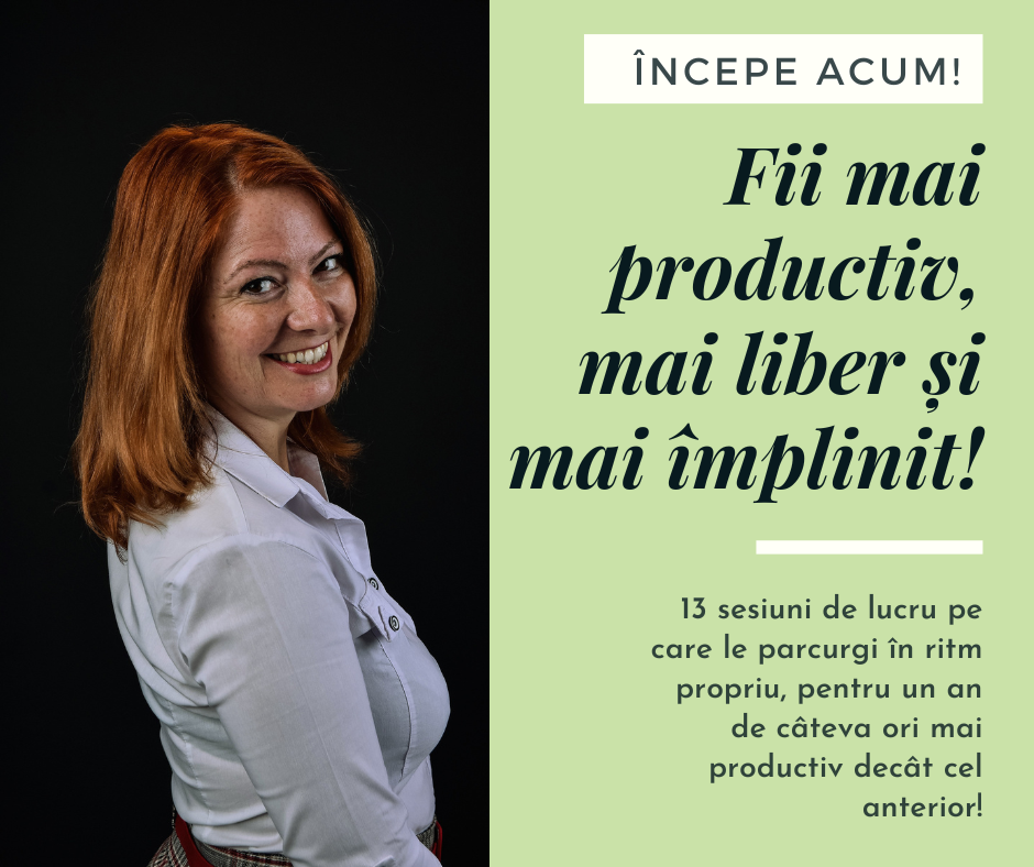13 sesiuni de lucru în ritm propriu în care îți dezvolți modalități strategice de a acționa, înveți cum să-ți folosești mai eficient resursele interioare, cum să te folosești de emoții pentru a-ți amplifica productivitatea, ce înseamnă un time-management de succes și ajungi să-ți dezvolți puterea personală, îți recapeți controlul asupra vieții tale și nu mai cazi în capcane.